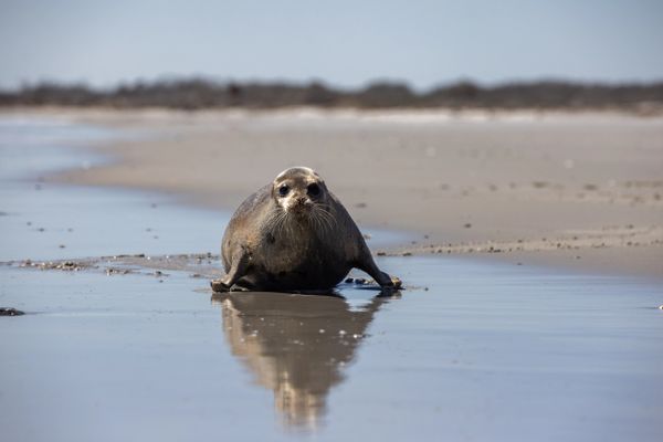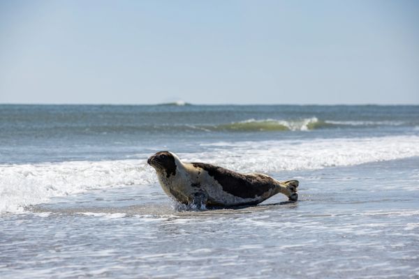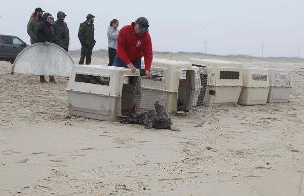 On April 20th this male Grey seal was spotted resting on the beach in Sea Girt. The injured seal was suffering from severe edema (swelling) of his right rear flipper and had several minor wounds on his left rear flipper. The Stranding Team immediately transported him to the Marine Mammal Stranding Center where he was admitted into the hospital for treatment. Upon his arrival, the team cleaned his wounds and administered supportive care and nutritional support via tube feeding a mixture of formula and electrolytes. Oral and topical medication were started to prevent infection, as well as pain medication to help keep him comfortable as he recovered. His intake weight was 55.8 lbs. After several months of treatment, his wounds healed.