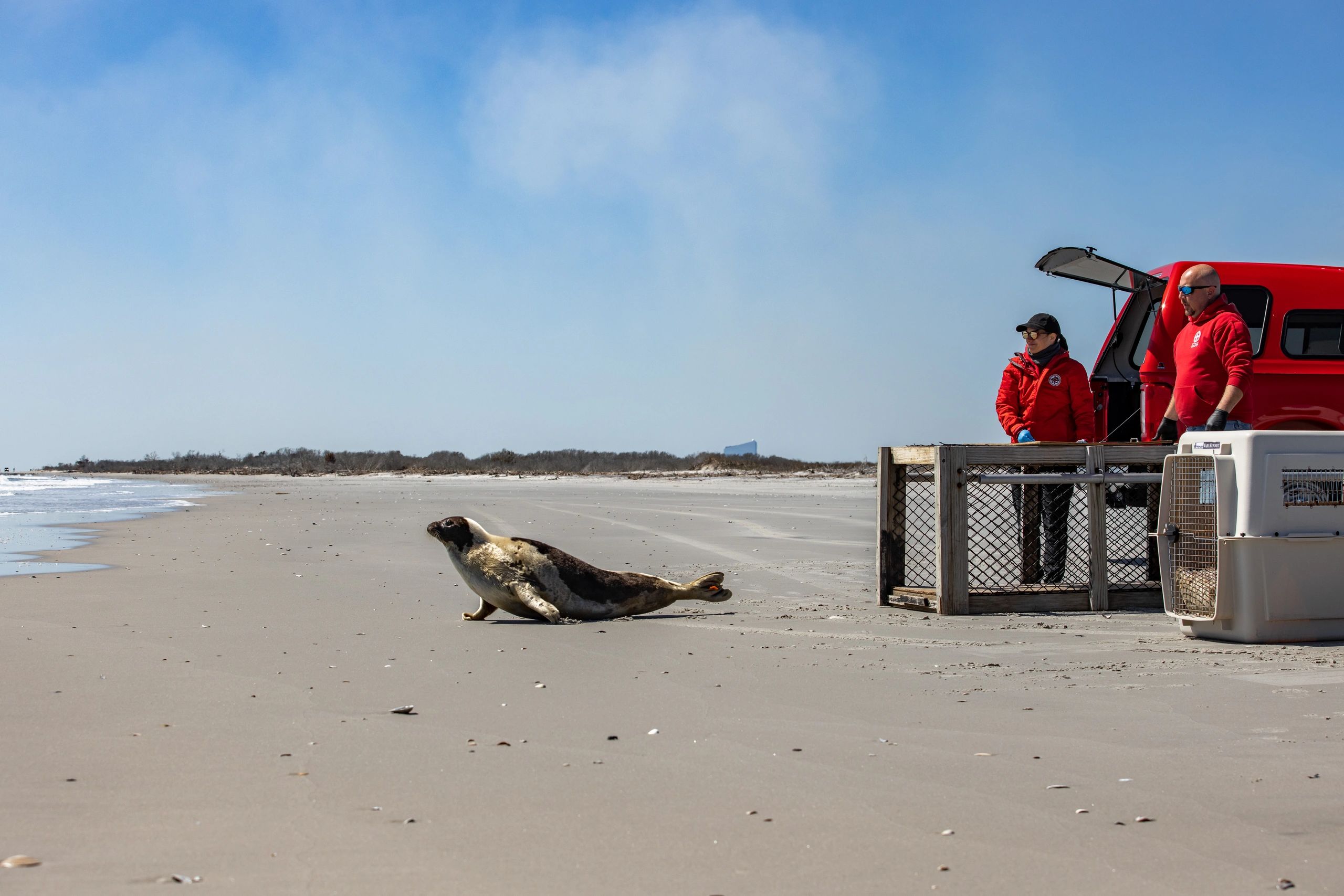 Update 5/8- Fully-recovered and weighing a healthy 82.3 lbs, he was ready to be returned to the wild. Tagged #2 on his left rear flipper, he was released on 5/8/25 at the North Brigantine Natural Area.