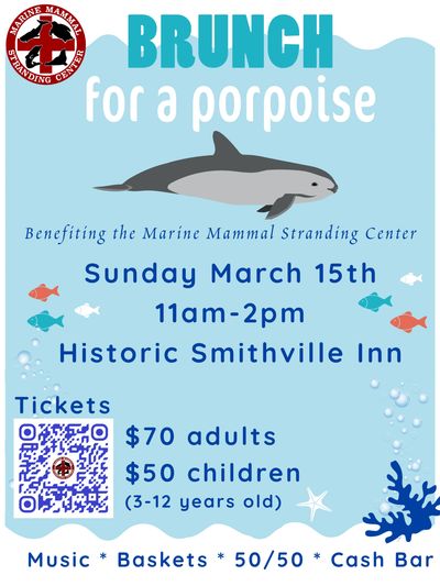 Join us at the Historic Smithville Inn to brunch for a "porpoise" and aid MMSC in our efforts to RESCUE, REHABILITATE & RELEASE marine mammals and sea turtles in New Jersey. Enjoy a delicious brunch buffet, cash bar, music, a delightful selection of baskets and 50/50 raffle.